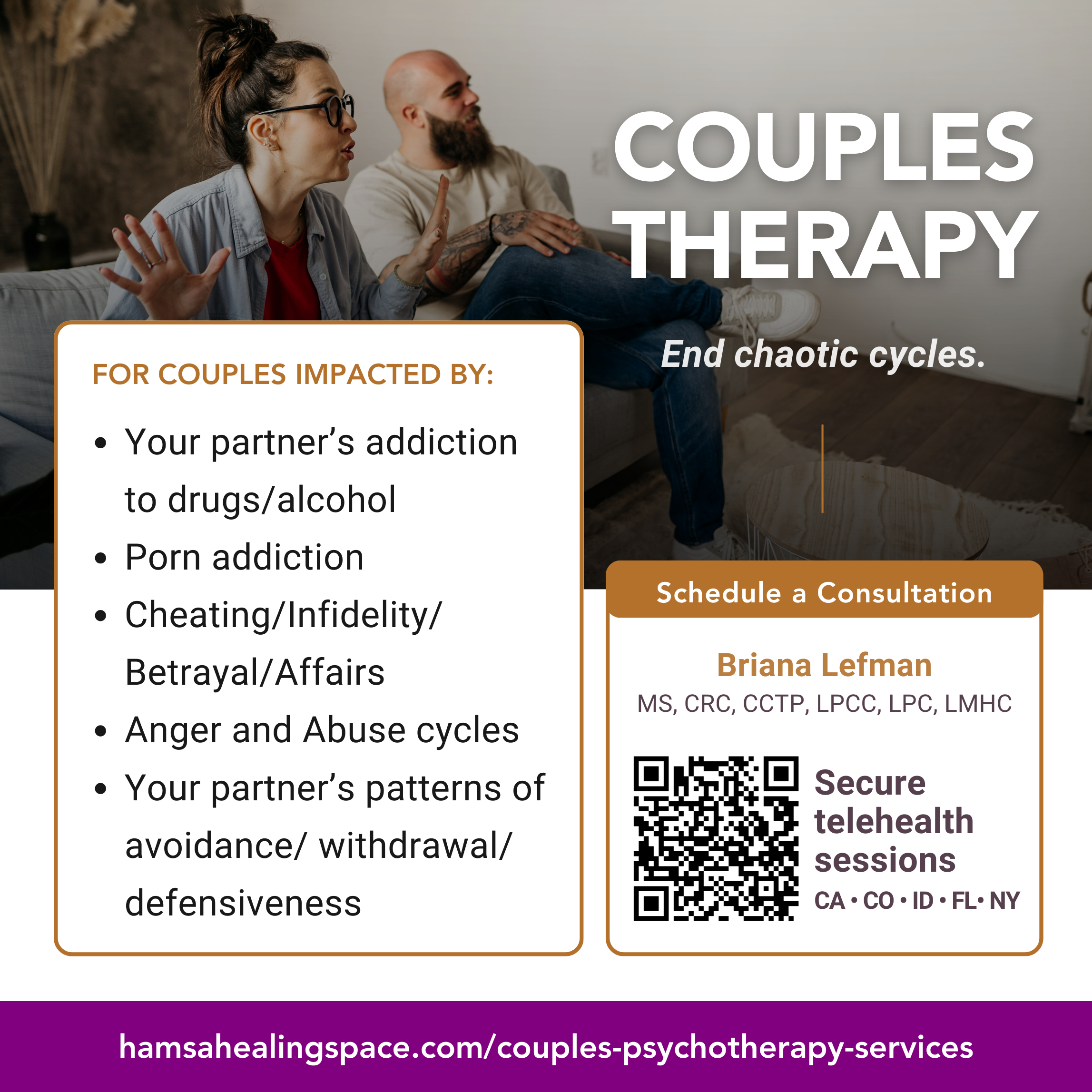 I provide couples therapy for partners navigating the aftermath of betrayal, infidelity, addiction, or emotional avoidance. Many couples come to me feeling lost, disconnected, and unsure if repair is possible after trust has been broken. My role is to help both partners understand the underlying dynamics that contributed to the rupture and to create a structured path forward—whether that means rebuilding the relationship or reaching clarity about its future.